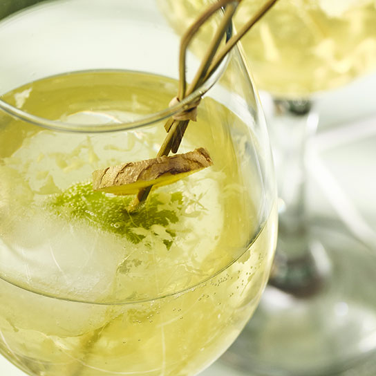 Décoration : Une fine tranche de gingembre frais ou gingembre confit. Une demi-tranche de citron vert et un bigarreau rouge.