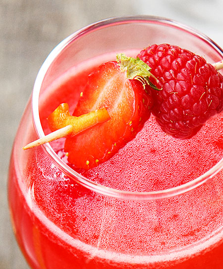 3/ Au moment de servir, répartissez la base du cocktail dans 4 verres à vin, ajoutez 8 cl de vin liquoreux dans chaque verre.