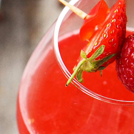 1/ La veille, préparez la base du cocktail : écrasez les framboises, ajoutez la purée de fraise, le piment oiseau et le poivre du Sichuan. Versez 12 cl de vin liquoreux. Laissez infuser 30 minutes.