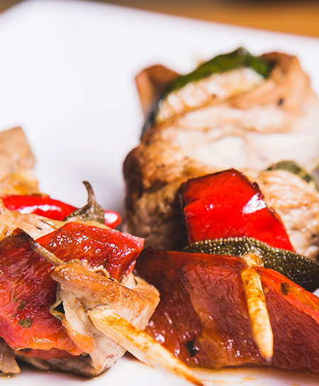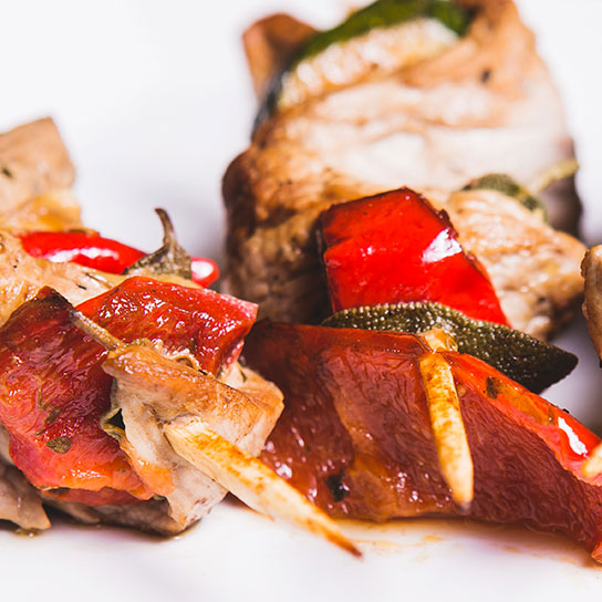 3/ Piquez sur vos brochettes le veau en alternance avec des feuilles de sauge et vos légumes marinés (frais ou en conserve).