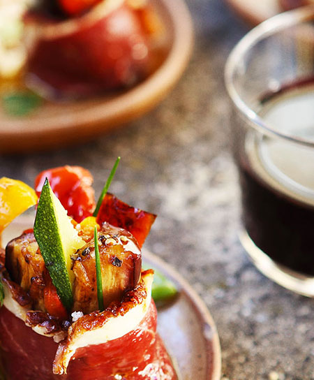 4/ Faites chevaucher 2 tranches de magret, posez un bâtonnet de chaque légume sur une extrémité puis roulez l’ensemble pour obtenir de petits fagots. Parsemez l’ensemble d’ail et de thym, enfournez à 180 °C pendant 5 à 6 minutes.