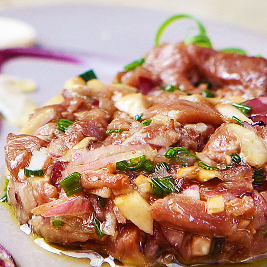 5/ Mélangez l’ensemble, assaisonnez de sel, de poivre, de ciboulette, d’huile de noix et de vinaigre de riz noir.