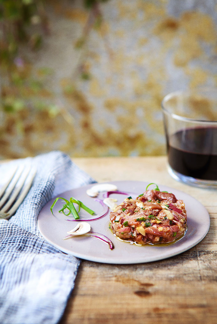 4/ Détaillez-le en petits cubes ainsi que l’oignon rouge et les champignons.