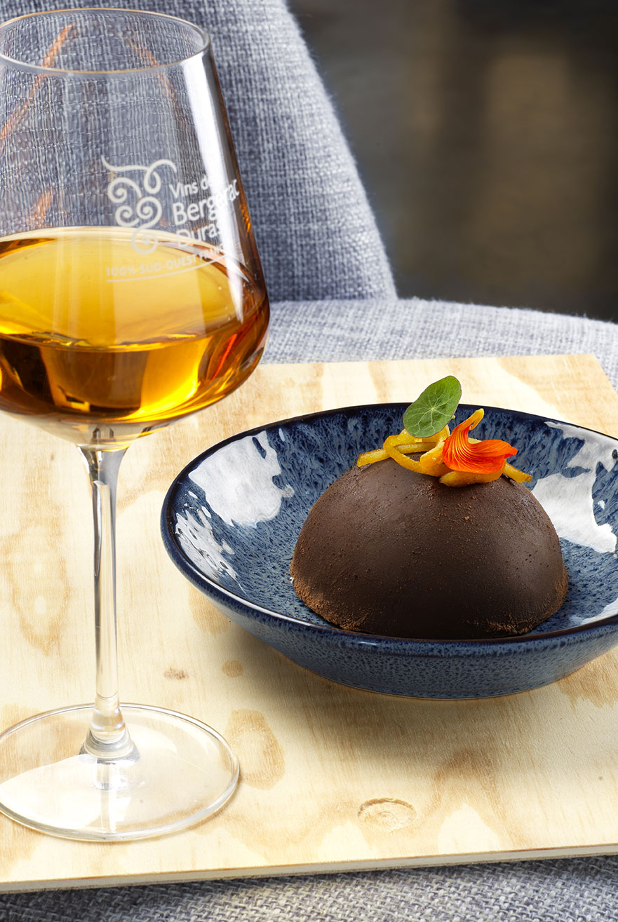 Demi-sphère chocolat, biscuit vanille et oranges caramélisées
