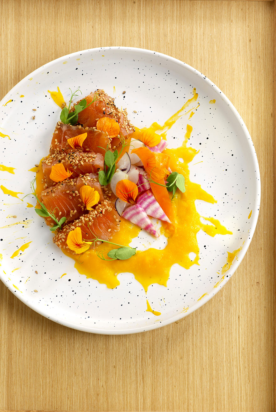 Gravlax truite au sésame, crème de potiron et légumes croquants