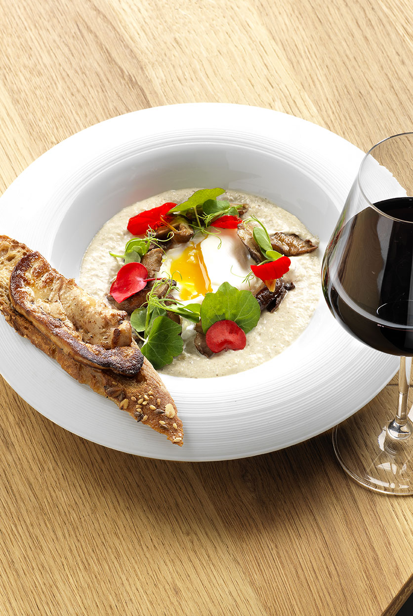 Œuf poché, crème de champignons, Foie Gras du Périgord poêlé